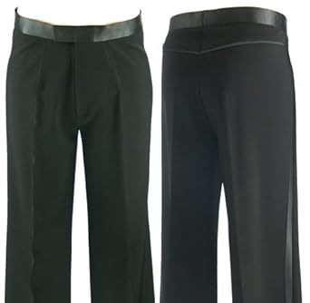 Unhemmed bottom (35" most inseam).Men's dance pants in black (order by using waist size).Stretchable fabrics (96% polyester 4% spandex).Wide leg design and flare backside.Permanent sewn in crease; satin aspect piping, waist and back yoke. Men's dance pants are made through Star Dance USA. They are designed for ballroom and latin dancers. The broad leg design and minor flare backside allow dancers to experience freedom of movement. The heavy drape cloth present dancers with beautiful line during dancing motion.. ... Read more MDP102 Men's dance pants (w79_31")